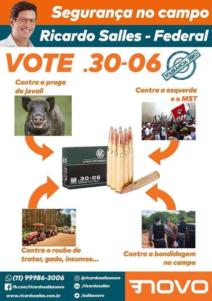 Ele foi um dos principais candidatos do Partido Novo para deputado federal por São Paulo – e foi derrotado. No Twitter, o então candidato fez apologia ao uso de armas. “O cidadão de bem só quer se armar para se defender”, diz em uma das publicações. Seus alvos eram a “esquerda e o MST”, além da “bandidagem do campo”.